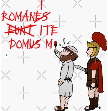 이 영화의 주인공은 예수가 태어난 바로 그 타이밍에 바로 옆집에서 태어난 유대인 청년 브라이언인데, 로마 식민제국에 대항하는 ‘유다인민전선’에서 브라이언이 맡은 첫 임무는 '로마인 집이 간다(Romanus eunt domus)'라는 라틴어를 밤새 벽에 쓰는 것이었다. 하지만 이건 당연히 틀린 문장. 순찰하던 로마 백인대장에게 붙잡힌 브라이언은 ‘로마인들은 집에나 가라!’라는 뜻으로 쓰려면 “Romani ite domum!”라고 써야 한다는 문법 교육을 받는다(라틴어 활용 어미, 호격 복수형, 명령법, 목적격 및 그 예외까지…상세하지만 친절하지 않은 문법 교육을 받는다).