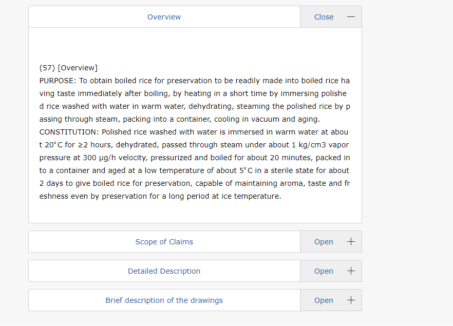 명세서의 부분 부분을 나누어 별도의 구획에 넣어둔 세심함은 참 고마우나, 막상 분량이 많은 Detailed Description을 열어보면, 텍스트가 조금씩 조금씩 번역되어 나오기 때문에 한참을 기다리면서 마우스를 스크롤 해야 합니다. 구글 특허 사이트처럼 전체 내용을 한꺼번에 보여줘도 서버에 별다른 무리가 가지 않을 것 같은데 참 아쉽습니다. 그렇다고 기계 번역의 수준이 다른 사이트들보다 더 좋다고 말하기도 어렵습니다. 구획별로 나누어져 있다보니, 브라우저의 search기능 (ctrl+F)를 써서 용어를 검색하기에도 너무 불편합니다. 이래 저래, 시원시원한 검색이 안 되네요.