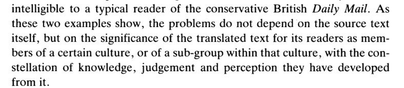 (번역과정에서 마주치는) 어려움은 출발 텍스트 그 자체보다는, 독자들이 자신들만의 지식과 판단과 인식의 집합체를 구축한 어떤 문화집단, 또는 하위 문화집단에 속한다는 사실에서 나온다.